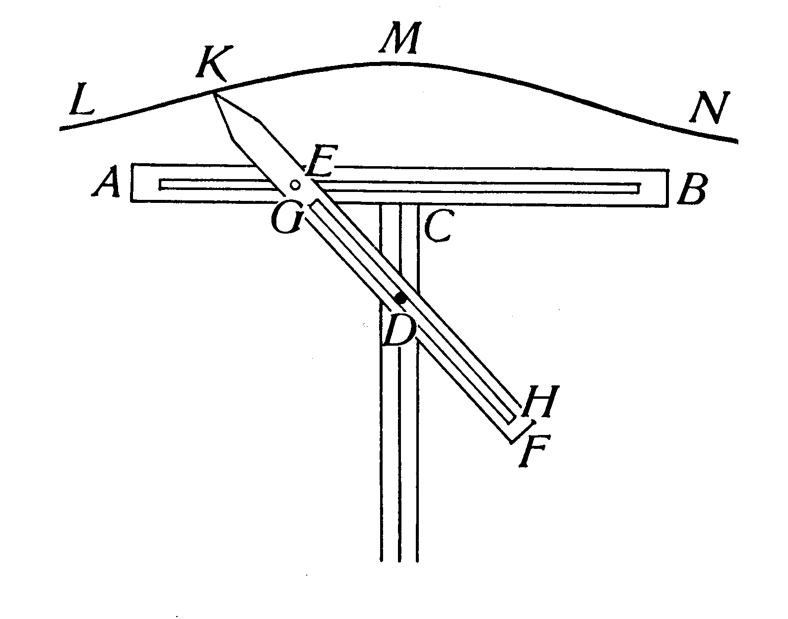 Parabolograaf van Frans van SchootenOm mechanisch een parabool te tekenen zetten we eerst een lange lat vast op het papier. Deze lat heeft een gleuf waar knop G in bewegen kan. We zetten de parabolograaf vast in punt B, plaatsen een potlood in de kruising van de twee latten met een gleuf. Het apparaat is nu klaar voor gebruik. We bewegen knop G langs de lange lat en het potlood beweegt in de kruising mee en tekent zo de parabool. |