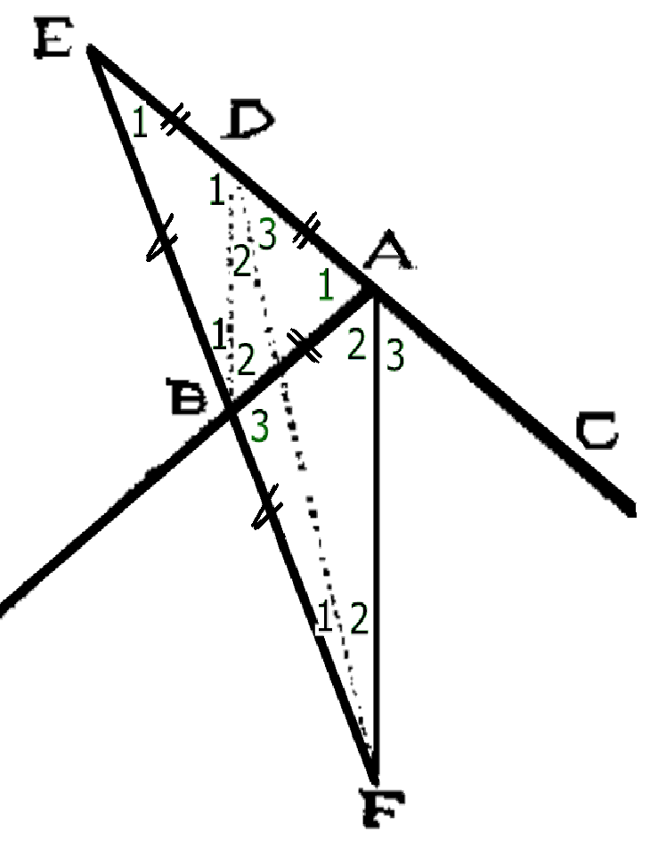 Achtergrond Frans van Schooten Jr trok een paar lijnen en beweerde dat hij zo een hoek in twee gelijke hoeken deelde. Hij behandelde in zijn boek "Mathematische Oeffeningen" verschillende manieren om een hoek in twee gelijke hoeken te delen. Op bladzijde 123 werkte hij deze manier uit. Daar kun je lezen hoe hij de punten A, B, C, D, E en F koos. In de constructie staat dat je willekeurig drie punten A, B en C kiezen mag. Ook staat er dat punt D en E op lijn AB liggen met AB = AD = DE en dat punt F ligt op lijn BE met BE = BF. | |