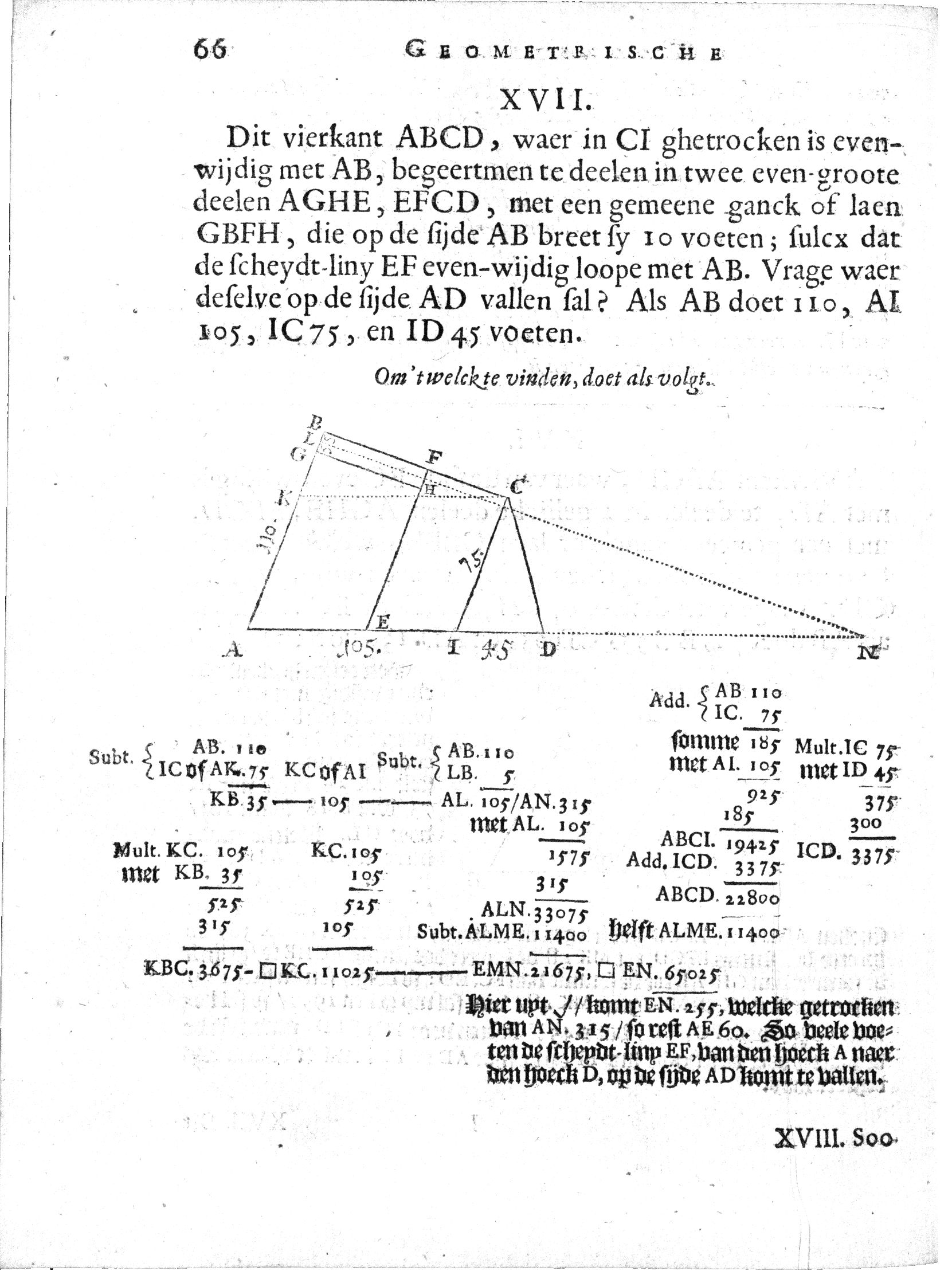 XVII Een vierhoekig stuk land ABCD wordt verdeeld in twee even grote stukken met een gezamenlijke gang GBFH.