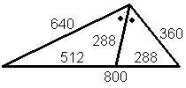 Gelijk het tweede voorbeeld: omdat 640 : 360 = 512 : 288 is de tophoek inderdaad in twee gelijke hoeken gedeeld. Met de stelling van Stewart is de lengte van de deellijn uitgerekend. Die is inderdaad exact 288.