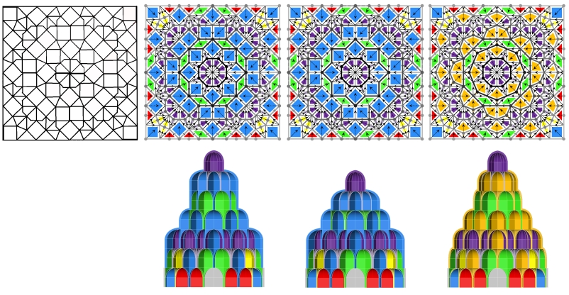 The projection of a 3D muqarnas onto a plane forms a type of tessellation. However, a projection inherently contains less information than the original 3D structure, making it unclear whether a 2D tessellation can fully determine its 3D counterpart. |  |