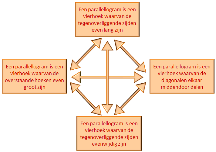 Het boek geeft vier definities van een parallellogram. Die vier definities zijn equivalent: je kunt namelijk vanuit iedere definitie elke andere definitie bewijzen.