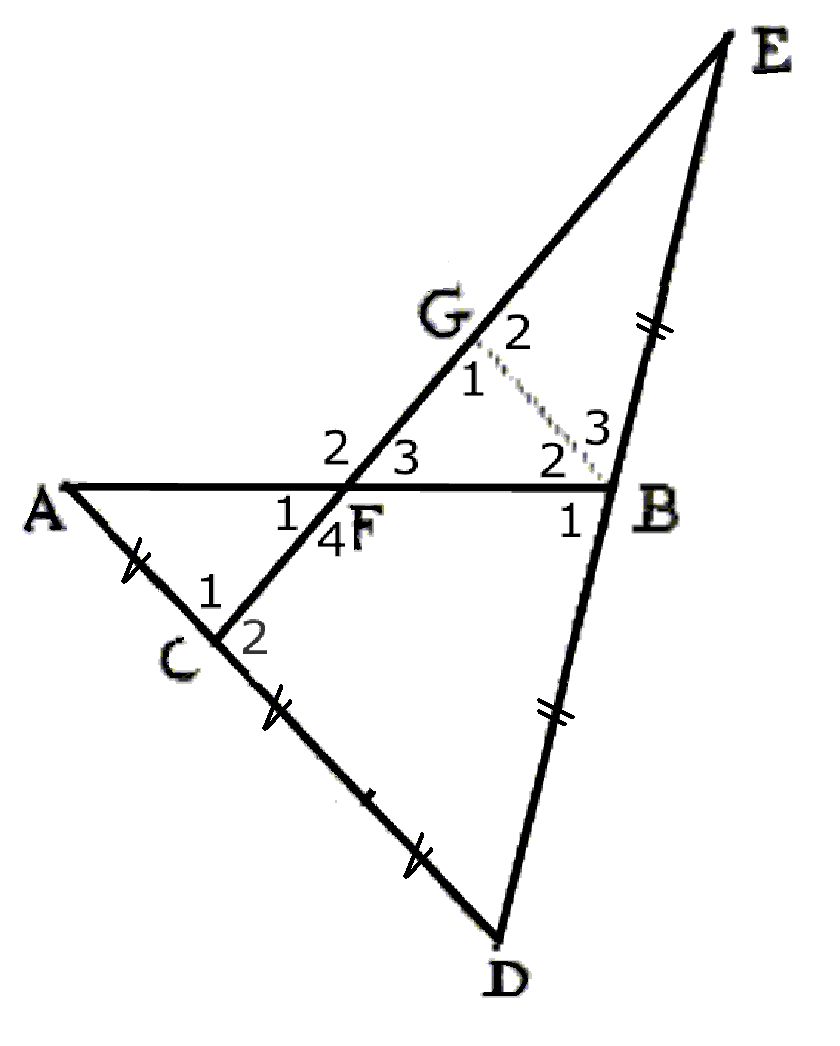 Omdat ∆CDE en ∆GBE dezelfde hoek hebben in E en de overeenkomstige hoeken F-hoeken zijn (stap 2)
