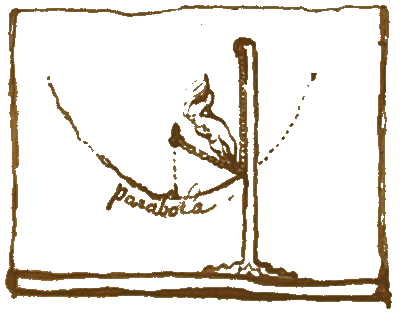 Parabolograaf van Frans van SchootenOm mechanisch een parabool te tekenen zetten we eerst een lange lat vast op het papier. Deze lat heeft een gleuf waar knop G in bewegen kan. We zetten de parabolograaf vast in punt B, plaatsen een potlood in de kruising van de twee latten met een gleuf. Het apparaat is nu klaar voor gebruik. We bewegen knop G langs de lange lat en het potlood beweegt in de kruising mee en tekent zo de parabool. |