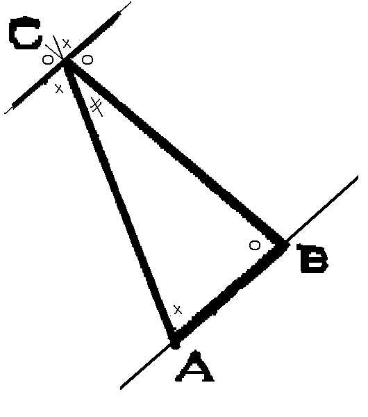 Gegeven driehoek ABC met hoeken A, B en C, te bewijzen is dat de som van de drie hoeken een gestrekte hoek is, dat wil zeggen, twee keer een rechte hoek is, oftewel ∠A + ∠B + ∠C = 180°.