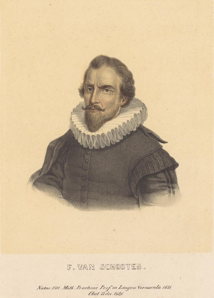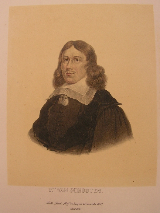 Litho'sFrans van SchootenIn het regionaal archief Leiden liggen object PV60890 (litho) en object PV60891 (litho in kleur) met beschrijving: Litho in kleur, Frans van Schooten jr. (1615-1660). Hoogleraar in de Wiskunde. Borstbeeld links, met platte kraag en toga. Met naam en 2-reg. lat. onderschrift. De litho's zijn ook onderdeel van de collectie Bodel Nijenhuis, toegeschreven aan Leendert Springer, gedateerd 1850. | |||