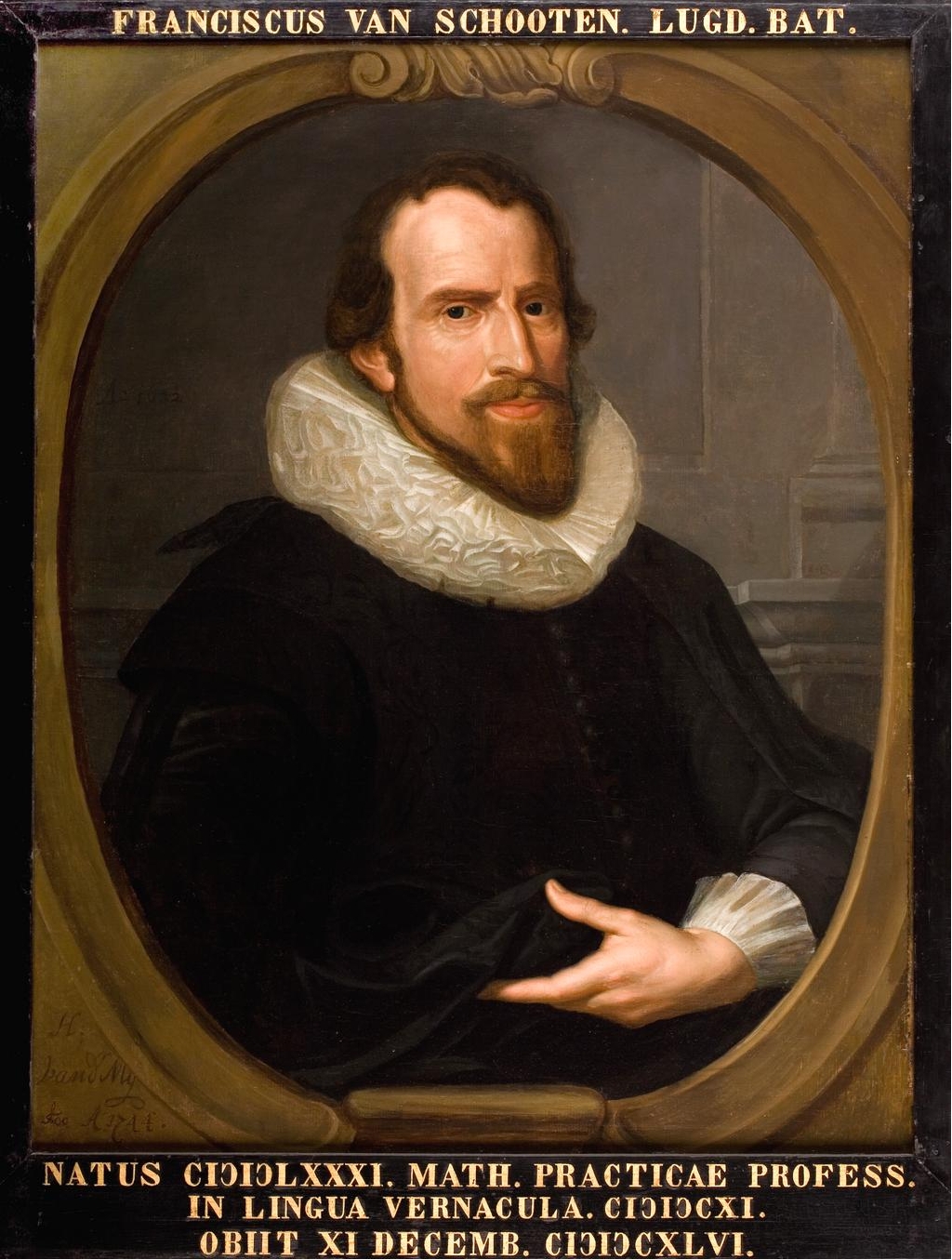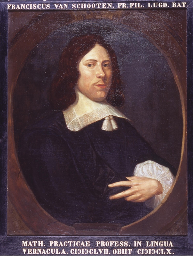 Museum BoerhaaveIn 2011 verwierf Museum Boerhaave onderstaand schilderij. Onderstaande tekst komt uit het persbericht Museum Boerhaave verwerft portret geleerdenechtpaar uit Gouden EeuwMuseum Boerhaave heeft de hand weten te leggen op een kwalitatief hoogstaand schilderij uit de Gouden Eeuw dat nauw aansluit bij de eigen collectie. Bij het veilinghuis Lempertz in Keulen kocht het museum zaterdag 14 mei een zeventiende-eeuws Noord Nederlands dubbelportret van een wiskundige en zijn vrouw. Dergelijke geleerdenportretten komen zelden op de markt. De Vereniging Rembrandt en De Stichting dr Hendrik Muller's Vaderlandsch Fonds maakten de aankoop van het olieverfschilderij (afmetingen: 118,5 bij 111,5 cm) mogelijk door in een spoedprocedure het museum financiële steun te verlenen. Het dubbelportret door een onbekende Nederlandse meester brengt de wetenschap van de Gouden Eeuw op prachtige wijze in beeld. De vrouw houdt in haar rechterhand een schietlood. Haar andere hand rust op een proportionaalpasser (waarmee je kon rekenen) en een grafometer (voor het meten van hoeken) - instrumenten zoals die zich ook in de collectie van Museum Boerhaave bevinden. De man houdt een passer vast en een kaartblad met de vestingstad Groenlo. Op tafel liggen een boek dat de stelling van Pythagoras uitlegt, een vel papier met berekeningen en een kompas. Al deze wiskundige instrumenten en documenten hebben te maken met de landmeetkunde. Deze tak van wetenschap is van oudsher nauw verbonden met de Nederlandse cultuur van het aanleggen van polders, het maken van kaarten en de stede- en vestingbouw. Op het gebied van landmeetkunde heeft Museum Boerhaave een instrumentencollectie van internationaal topniveau. Met het nu verworven geleerdenportret wil het museum het menselijke aspect van het wetenschappelijk bedrijf sterker in beeld brengen, en ook de historische context aangeven waarbinnen onze wetenschappelijke helden ten tijde van de Gouden Eeuw opereerden. De maker van het schilderij is vooralsnog onbekend. Wel valt er iets te zeggen over de intrigerende vraag wie de afgebeelde personages zijn. De landmeetkundige attributen op de voorstelling wijzen in de richting van de familie Van Schooten, een Leids geslacht van wiskundigen dat verbonden is met beroemde geleerden als René Descartes en Christiaan Huygens. Nader onderzoek naar het verhaal achter het geleerdenportret moet hierin klaarheid scheppen. Wie staat er op het schilderij?Mijn vermoeden is dat Frans van Schooten Senior (1581-1645) afgebeeld is en niet Frans van Schooten Junior (1615-1660).