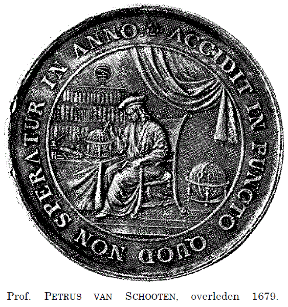 Petrus van SchootenIn het regionaal archief Leiden ligt object PV60895 met beschrijving: Pieter van Schooten (Leiden 1634-1679). Hoogleraar in de Wiskunde. Ten voeten uit, links, zittend in een stoel, in zijn studeervertrek, aan een tafel, waarop een globe. Op de achtergrond een boekenkast, globes en opgenomen gordijn. In medaillon met latijns randschrift. Op de keerzijde: zijn wapen met sterfjaar en latijns randschrift. | |||