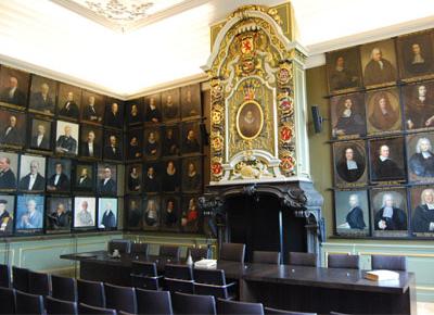 Academiegebouw universiteit LeidenIn het Academiegebouw van de universiteit Leiden hangen twee schilderijen van Frans Senior en Junior. Volgens de beschrijving zijn ze gekopieerd naar een ouder, nu onbekend schilderij, wellicht van de hand van Joris van Schooten. Ze zijn gesigneerd "Vandr Mij fec. Ao 1744". In 1733 besloten curatoren de collegekamer van de medische faculteit, voorheen het nonnenkoor, te verbouwen tot nieuwe Senaatskamer. Het ontwerp was van de schilder Hieronymus van der Meij. In 1735 werd besloten een galerij in te richten van professorenportretten, in beginsel te schilderen door Van der Meij. Hij heeft de schilderijen gemaakt op basis van het werk van Adriaen Cornelisz. Beeldemaker. | |||